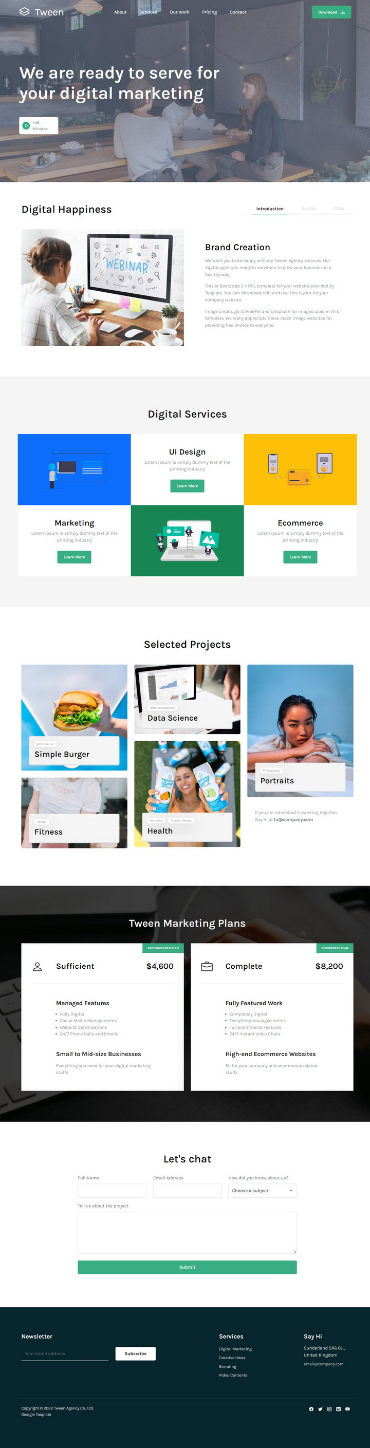 Tween Agency is a digital marketing HTML template based on Bootstrap 5 CSS layout. Homepage features simple fade in / out slider with 3 images. About section includes 3 full-width content tabs and FAQs tab has an accordion slider. Project section has a simple pop-up image. There are 2 different pricings in 2 columns. Standard HTML contact form is included.