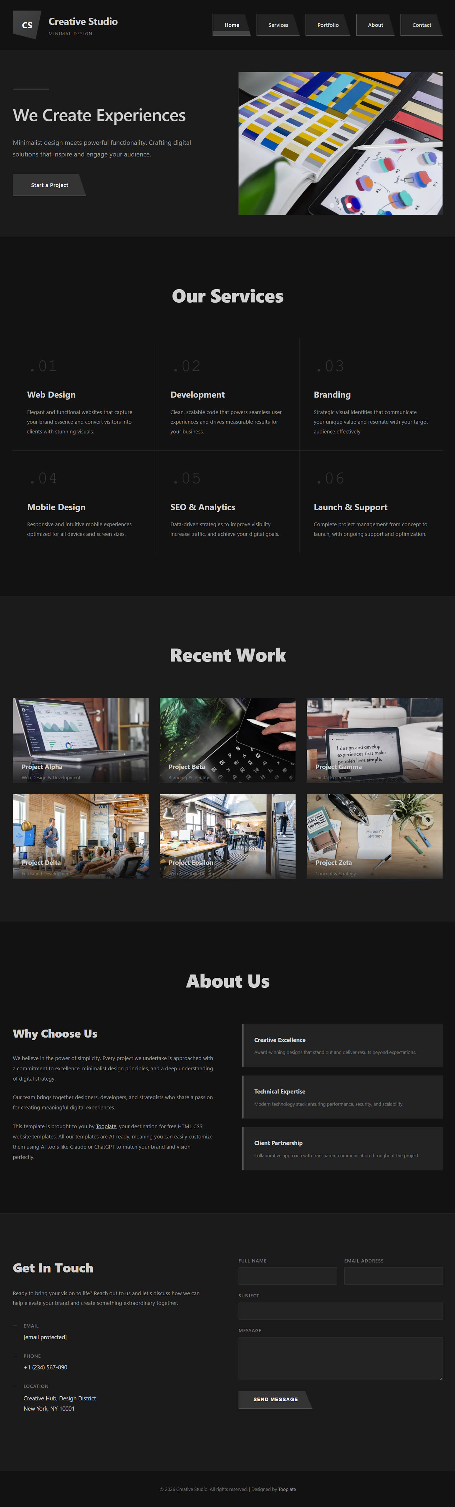 The portfolio section uses semantic HTML structure with hidden content blocks, making it easy to add or edit projects without touching JavaScript. The monochrome grey color scheme creates a sophisticated, professional appearance that lets your work stand out. All elements are AI-customizable, allowing you to easily adapt colors, content, and layouts to match your brand perfectly.